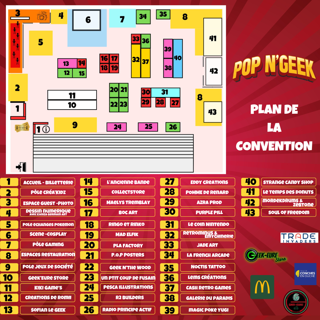 Espace jeux vidéo en accès libre (rétro + moderne) , Pôle cartes à collectionner : échanges et tournois. Bourse / stands spécialisés : jeux vidéo, figurines, vintage, jouets, pop culture, créateurs. Cosplay concours et défilé.